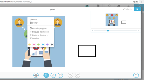 - Crea la primera nota adhesiva seleccionando “sticky” en el menú superior izquierdo, seleccionando un color y escribiendo en el campo de la nota. - Pulsa enter y arrastra el papel autoadhesivo en el tablero. -Se puede subir una imagen o documento. Un “sticky” de vídeo te permitirá vincular un vídeo de Youtube o Vimeo.