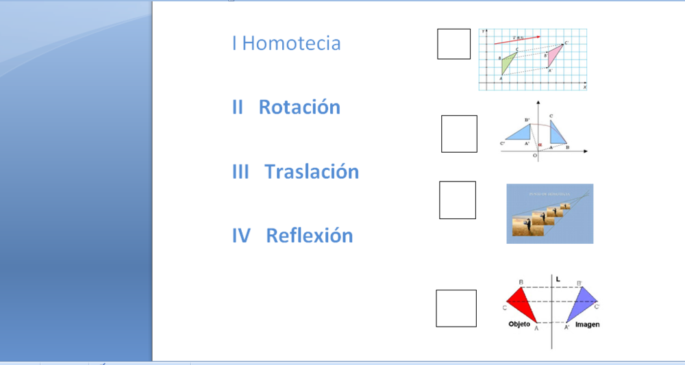 Las figuras planas se pueden transformar en el plano cartesiano aplicando una traslación , homotecia ,reflexión y rotación. Para cada figura plana considerada como la preimagen o figura original , se puede determinar otra figura denominada imagen,la cual se puede clasificar de acuerdo a las características determinadas en su trasformación.