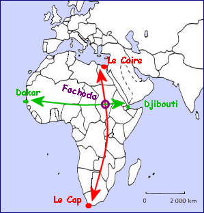 Los ingleses y los franceses tienen deseos similares, los dos quieren atravesar con una línea ferroviaria África, los ingleses lo harán de norte a sur mientras que los franceses lo harán de este a oeste. Llega un momento en el cual las dos potencias se juntan en Fachoda, obviamente los dos se quieren quedar con ese territorio. Fancia es el primero en hacerse con él porque las fuerzas madistas siempre repelían el ataque de los ingleses. pero cuando estos llegaron con muchos mas hombres que los Franceses que había en Fachoda, estos se retiraron ya que no querían ninguna guerra por África. Más tarde se pusieron límites o fronteras de Sudán para separar a las dos potencias. Al final Francia se quedó con Marruecos a cambio de ceder a Fachoda. Esto enfureció mucho a Alemania.