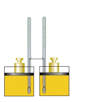 Caption: : OBSERVA LA ANIMACIÓN, LA PRESIÓN SE HACE CON LAS PESAS, ¿COMO ES EL VOLUMEN?, ¿QUE LE PASA A LA TEMPERATURA CUANDO AUMENTA LA PRESIÓN?