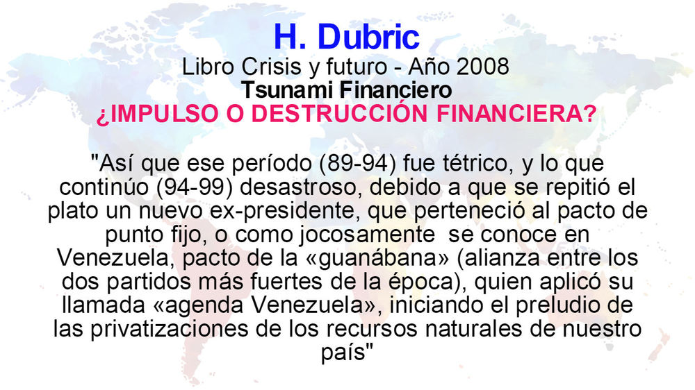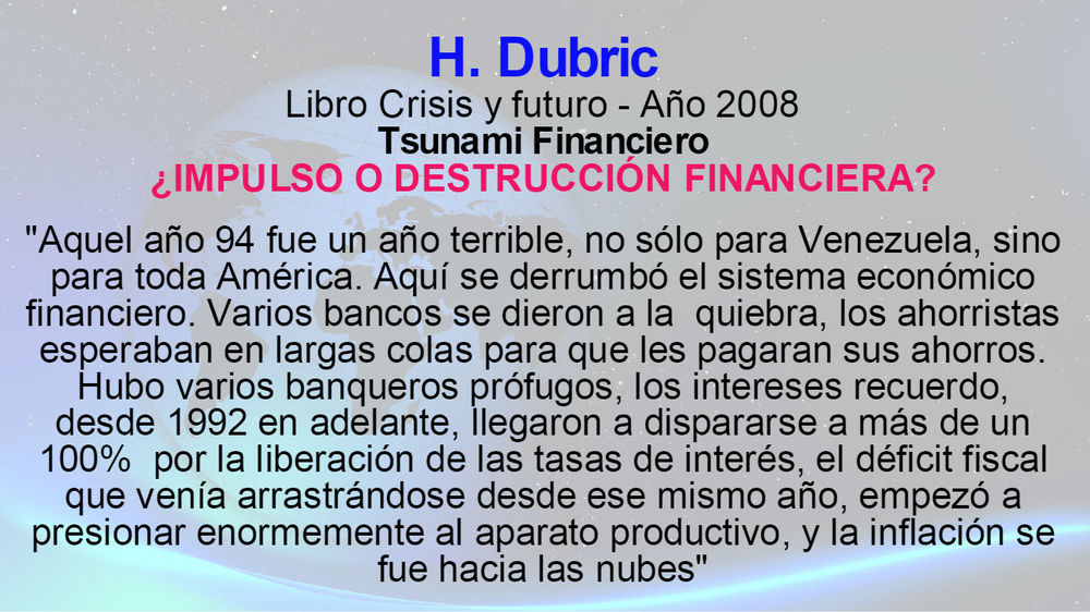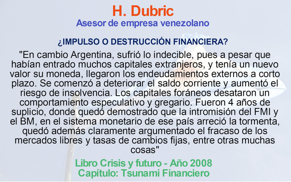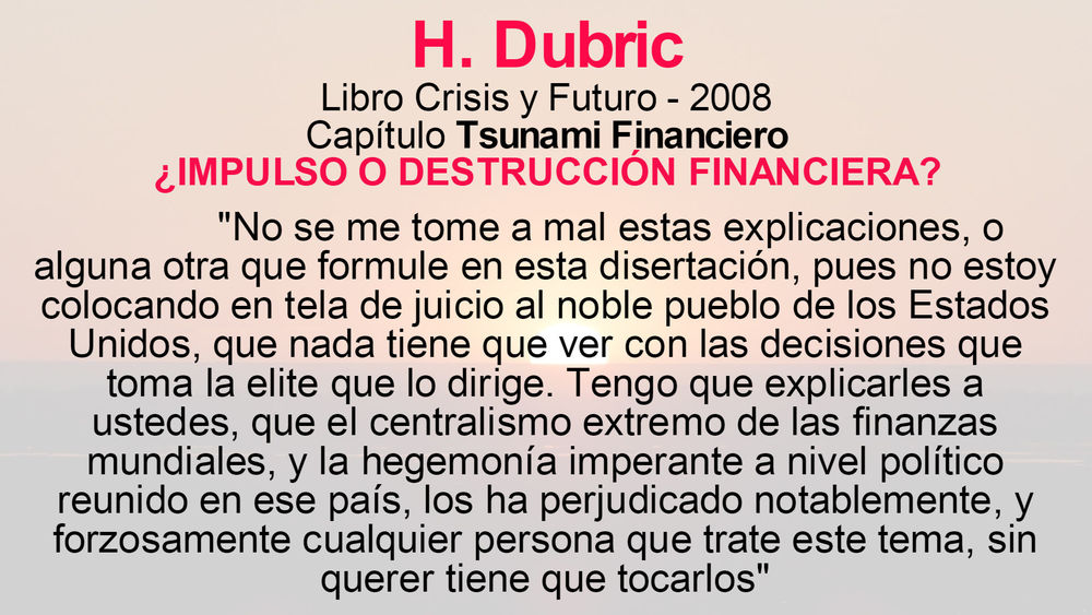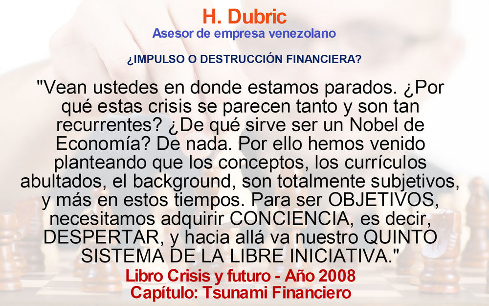 H. Dubric es un venezolano, asesor de empresas, escritor de temas gerenciales, con más de 30 años de experiencia. Ha llamado la atención en las áreas que dinamizan y entrelazan la convivencia humana, con su QUINTO SISTEMA DE DIRECCIÓN Y MANEJO DE LA LIBRE INICIATIVA, alertando que se va por el rumbo equivocado, pudiendo darle un vuelco al timón para enderezar el barco de la vida y tener por consiguiente una salida a las CRISIS.