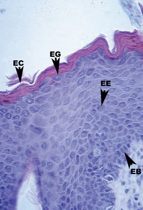 Es la capa más externa de la piel y está compuesta por múltiples capas de células definidas por su posición, forma y estado de diferenciación de los queratinocitos:
