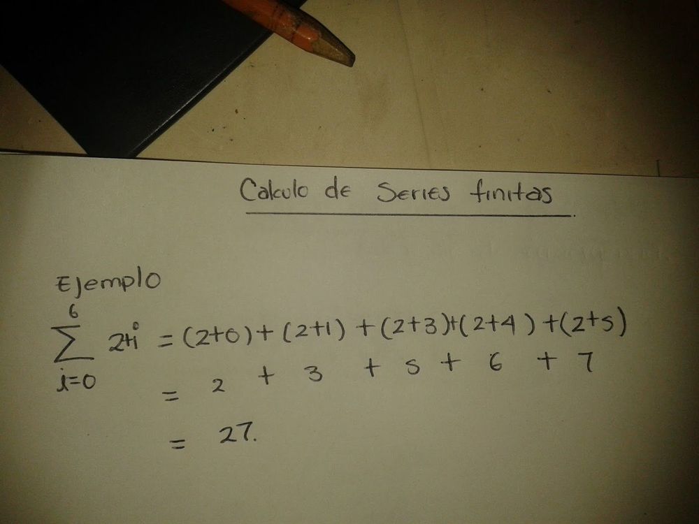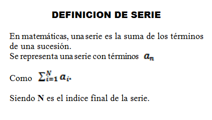 "Sucesiones" y "series" pueden parecer la misma cosa... pero en realidad una serie es la suma de una sucesión.Sucesión: {1,2,3,4}Serie: 1+2+3+4 = 10Las series se suelen escribir con el símbolo Σ que significa "súmalos todos":Esto significa "suma de 1 a 4" = 10 Esto significa "suma los cuatro primeros términos de la sucesión 2n+1" Que son los cuatro primeros términos de nuestro ejemplo {3,5,7,9,...} = 3+5+7+9 = 24