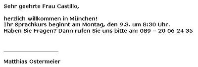 herzlich willkommen in München! Ihr Sprachkurs beginnt am Montag, den 9.3. um 8:30 Uhr. Haben Sie Fragen? Dann rufen Sie uns bitte an: 089 – 20 06 24 35 _______________