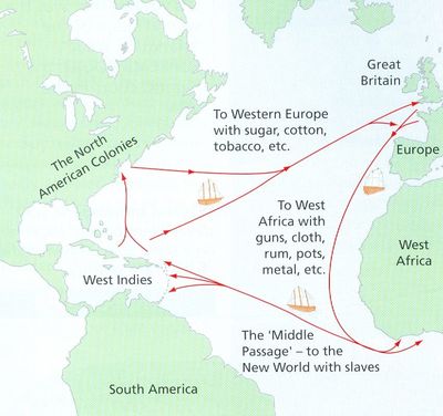 At first, slaves were used in the Caribbean as well as Central and South America. They worked on plantations producing sugar, coffee, rice, cotton and tobacco. The British also decided to use slaves in their North American colonies. As the number of plantations grew, farming became the main source of economic wealth for White farmers. More and more slaves were needed and a 'triangular trade' developed. Many European merchants made a financial fortune controlling the triangular trade making the most profit out of it.