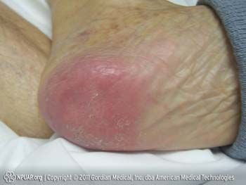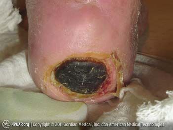 On assessing your patient's sacral pressure ulcer, you note that the tissue over the sacrum is dark, hard, and adherent to the wound edge. What is the correct stage for this patient's pressure ulcer?