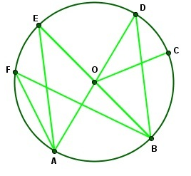 En la circunferencia de centro O y radio OC, a la que pertenecen los puntos A, B, C, D, E y F, se han trazado varios ángulos inscritos y centrales.