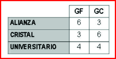 Se juega un triangular de fútbol entre Alianza, Cristal y Universitario jugando dos partidos cada equipo. Luego de concluido el triangular, se presenta la siguiente tabla con los goles a favor (GF) y los goles en contra (GC) que tuvo cada equipo. Se pide encontrar cuántos goles hubo en el partido “ ALIANZA - UNIVERSITARIO” Observe la figura