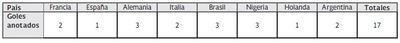 Campeonato Mundial de Futbol. Francia 2 goles, España 1, Alemania 3, Italia 2, Brasil 3, Nigeria 3,