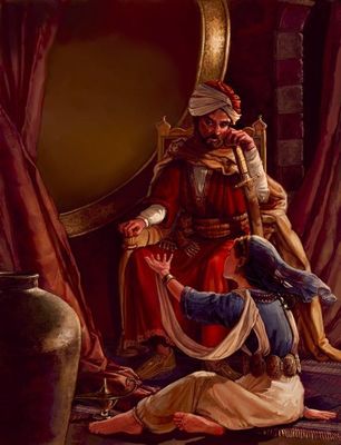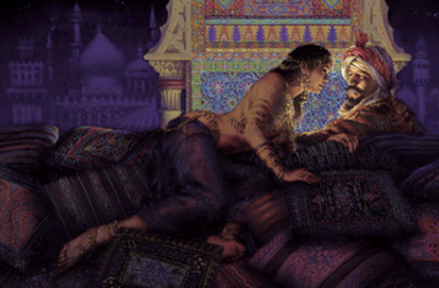 Annotate this image of King Schahriar and Scheherazade to show the different types of power explored in the narrative.