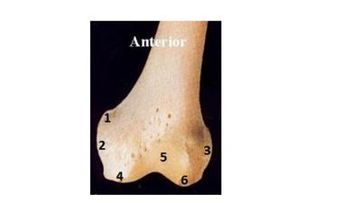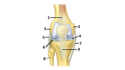 ¿Con qué números están señalizadas las siguientes estructuras: Ligamento rotuliano, Epicóndilo lateral, Menisco medial, Ligamento colateral lateral y cabeza de la fíbula?:
