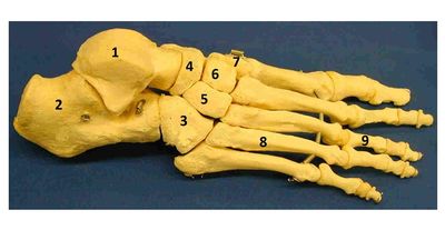 Los huesos del pie señalados con los números 1, 3, 7 y 9 son:
