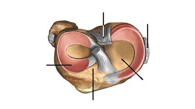 El fémur y la tibia mejoran el contacto de sus superficies articulares, principalmente gracias a: