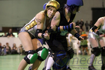 Una jammer llega al pack y frena bajando el tronco e impactando con la cabeza a una bloqueadora rival en zona legal. Esto es un/a: