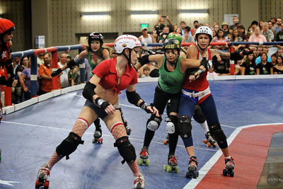 Una patinadora tiene un patín dentro de la pista y otro fuera. Una rival realiza un bloqueo sobre ella, esto es un/a: