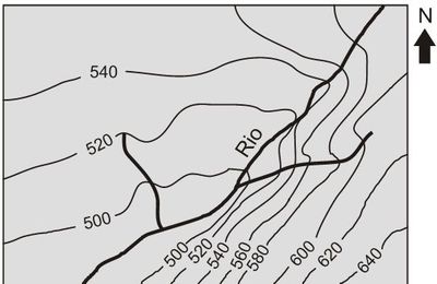 Responda à questão com base no desenho, que representa uma área de relevo em curvas de nível, preenchendo os parênteses com V (verdadeiro) ou F (falso).