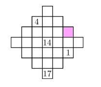 Ana Paula tiene que poner números enteros en los cuadrados de la figura de tal manera que por cada 3 cuadrados consecutivos en la misma línea (tanto horizontal como vertical) , el número que quede en el cuadrado de enmedio sea el promedio de sus dos vecinos. Algunos números ya se escribieron, ¿qué número debe escribir en el cuadrado sombreado?