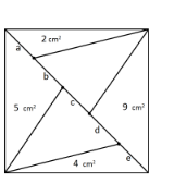En una cuadrado con 30 cm2 de área se dibujó una diagonal. Posteriormente, se dividió en 6 triángulos, como se muestra la figura, en donde también se han marcado las áreas de algunos de esos triángulos. ¿Cuál de los segmentos a,b,c,d, y e de la diagonal es más largo?