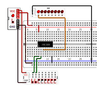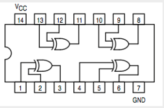 El siguiente diagrama muestra que se debe de emplear para el buen funcionamiento del CI. Donde el pin 6 está conectado a tierra (cable negro) y el pin 14 a voltaje (cable rojo). Los pines 3 y 4 debido a que son entradas están conectados al módulo de interruptores (cables verdes). El pin 2 debido a que es salida está conectado al módulo de LED`s (cable naranja). En este caso hay una salida en alto debido a que están activadas las dos entradas.