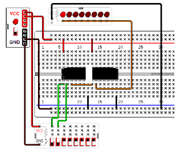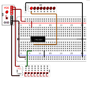 Demuestra el cableado que se debe de emplear, Donde el pin 7 está conectado a tierra (cable negro) y el pin 14 a voltaje (cable rojo). El pin 1 debido a que es una entrada está conectado al módulo de interruptores (cable verde). El pin 2 debido a que es salida está conectado al módulo de LED`s (cable naranja).