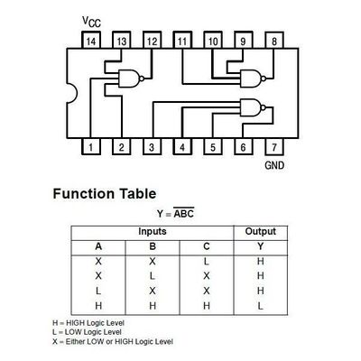 El siguiente diagrama muestra la conexión que se debe de emplear para el buen funcionamiento del CI. Donde el pin 7 está conectado a tierra (cable negro) y el pin 14 a voltaje (cable rojo). Los pines 1 y 2 debido a que son entradas están conectados al módulo de interruptores (cables verdes). El pin 3 debido a que es salida está conectado al módulo de LED`s (cable naranja). En este caso hay una salida en alto debido a que están activadas las dos entradas.