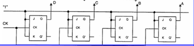 Suponiendo biestables JK con sincronismo por nivel alto, en la salida DCBA del siguiente circuito se estabiliza un numero aleatorio en binario natural coincidiendo con el flanco de bajada de la señal de reloj