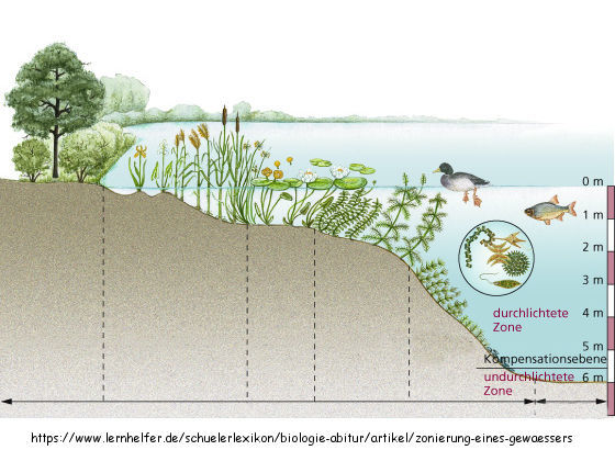 Bruchwaldzone, Röhrichtzone, Schwimmblattzone, Tauchblattzone, Tiefalgenzone, Uferzone, Tiefenzone, Freiwasserzone