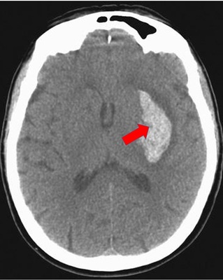 En la siguiente imagen de su libro de texto se nos muestra un ejemplo de Hemorragia por hipertensión, Mediante un TAC sin medio de contraste a través de los ganglios basales, que indica la presencia de un hematoma que afecta el putamen izquierdo, el individuo es casi seguro que presento hemiparesia derecha de inicio y evolución rápidos.