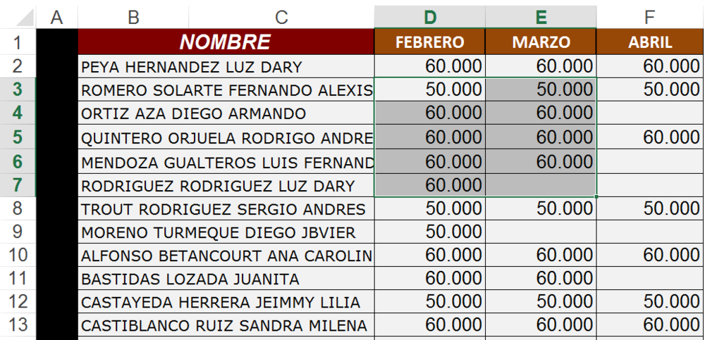 El área seleccionada (D3:E7) que se muestra en la figura corresponde al