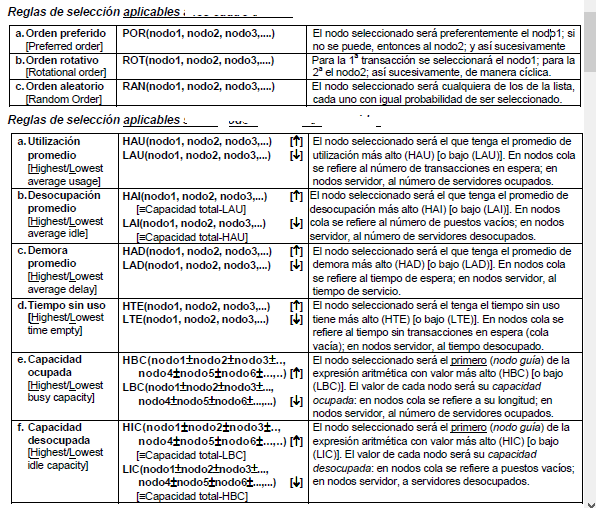 ------P Probabilística. Se selecciona el nodo destino con base en una ( probabilidad asignada, probabilidad ) a cada nodo especificado. La suma de estas probabilidades debe ser 1. Ejemplo: *N1/0.20,N2/0.30,N3/0.50 implica que el 20% de las veces irá al nodo N1