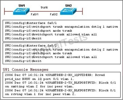 The link between switch SW1 and switch SW2 is configured as a trunk, but the trunk failed to establish connectivity between the switches. Based on the configurations and the error messages received on the console of SW1, what is the cause of the problem?