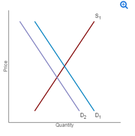 Consider the market illustrated in the figure. Supply curve S1 represents the private cost of production and demand curve D1 represents the private benefit from consumption. Suppose the consumption of this good creates a positive externality. In turn, the social benefit from consumption is represented by demand curve D2. Show how the externality affects market efficiency.