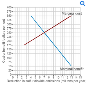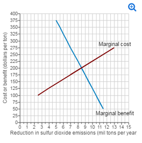 Suppose the figure to the right illustrates the marginal cost and marginal benefit from reducing sulfur dioxide pollution. Suppose also that the United States is currently planning to eliminate 5.5 million tons of pollution per year.