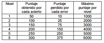En un juego de computador que tiene seis niveles de dificultad, se obtienen 2000 puntos adicionales cuando al pasar de un nivel a otro no se han cometido fallas. Sólo se puede pasar a un nivel superior cuando se ha obtenido un puntaje a favor. En cada nivel se presentan cierto número de pruebas y se ganan o pierden puntos dependiendo de las fallas o aciertos según la tabla.