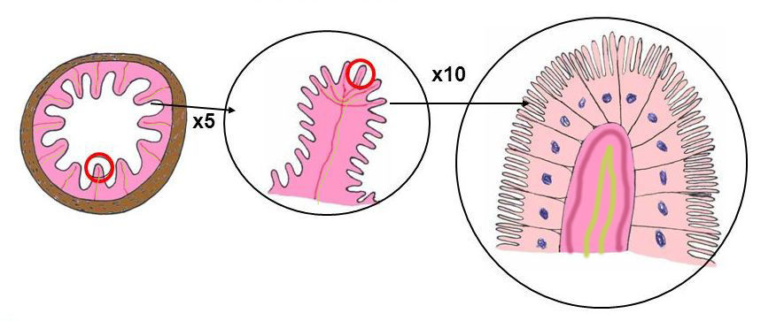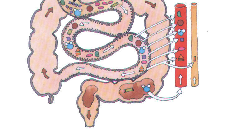 La mayor parte del y de las se absorben en el intestino grueso. Además las bacterias que viven ahí, que se llaman , fabrican algunas que también se absorben a la .