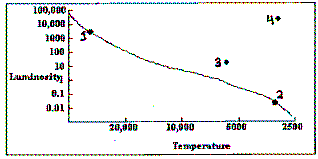 On the H-R diagram, the line indicates the location of the main sequence. Which of the four labeled locations on the H-R diagram indicates a luminosity and temperature similar to that of a T Tauri star?