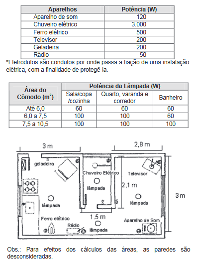 Considerando a planta baixa fornecida, com todos os aparelhos em funcionamento, a potência total, em watts,