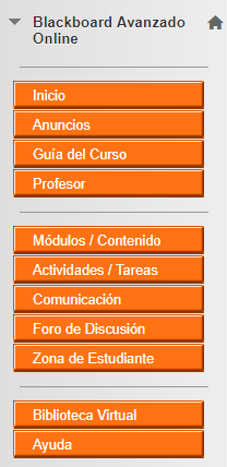 | Zona de Estudiante // Student Zone | Botón de área de herramientas que permite acceder a enlaces directos a todas las herramientas disponibles en el curso en Blackboard. Toolbar button that allows you to access direct links to all the tools available in the Blackboard course. |