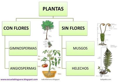 | Las plantas se clasifican en: plantas sin flor y plantas con flor. |