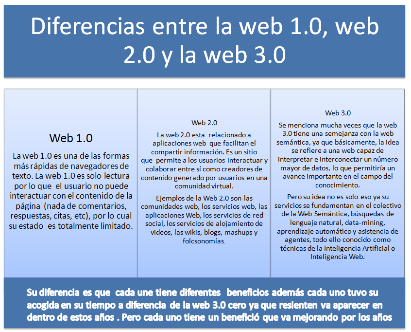 DIFERENCIAS WEB: 1.0. Unidireccional y estático 2.0. Red social (web colaborativa) 3.0. WEB SEMÁNTICA DE INTELIGENCIA |