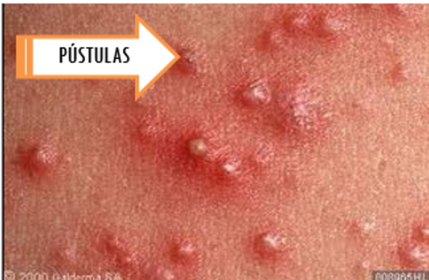 Pequeñas elevaciones de la piel llenas de pus;se describen como primarias cuando aparecen sin que haya sido precedida por otra deficiencia y secundarias, las que se presentan después de una vesícula o pápula. |