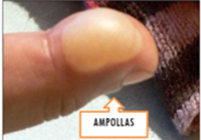 Elevaciones de la epidermis en forma de pequeñas bolsas llenas de líquido plasmático, cuyo diámetro es mayor de 5 mm, como las que aparecen cuando la piel es sometida a altos niveles de fricción y de forma prolongada. |