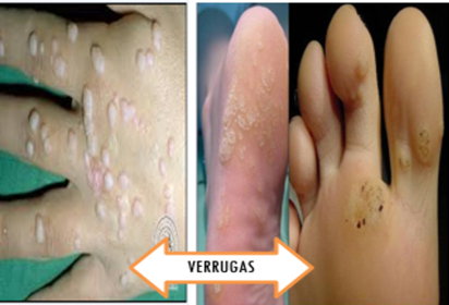 Protuberancias cutáneas generalmente redondas, derivadas de la hipertrofia de las papilas; aspecto de coliflor varia de tamaño; pueden ser de presentación única o múltiple. Localizadas en manos y pies. |