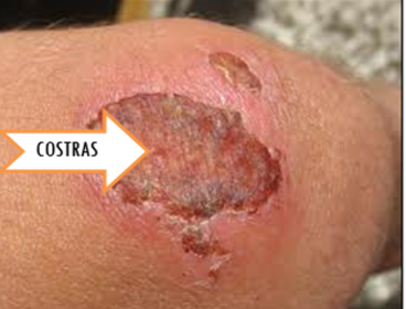 Cortezas externas sólidas, formadas por exudados o secreciones secas adheridas a la piel; pueden ser de sangre ( color vino tinto), pus ( color amarillo verdoso) y suero (amarillas). |