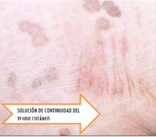 Se describen como fisuras (grietas cutáneas), excoriaciones(rasguños, raspaduras) y úlceras (varicosas, por presión y fricción). |