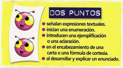 | DOS PUNTOS Los dos puntos sirven para presentar enumeraciones y separar oraciones cuyo significado está relacionado. |