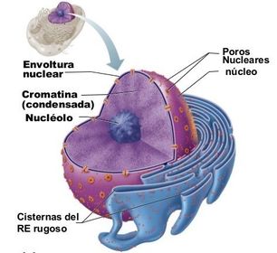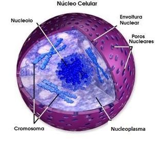 | PARTES DEL NÚCLEO | Las partes que en él se distinguen son: membrana o envoltura nuclear, poros nucleares, nucleoplasma, nucléolo y material genético que puede estar en forma de Cromosomas o de Cromatina, ambos formados por ADN. |