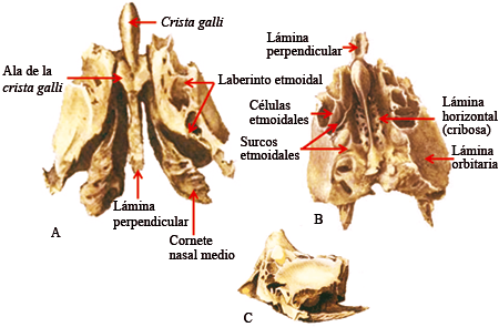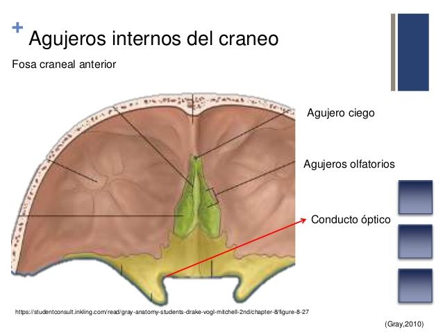| Agujero etmoidal anterior | Localizado: etmoides. Atraversado: Rama nasal interna del nervio oftálmico. Arteria y nervio etmoidal anterior. |