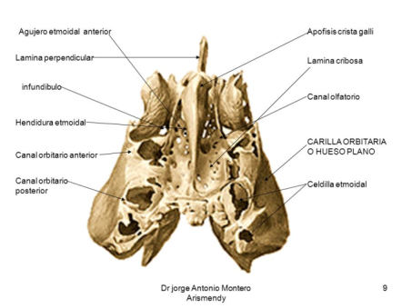 | Agujero etmoidal posterior | Localizado: etmoides Atraviesa: N. y A. etmoidales posteriores. |