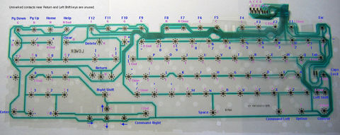 Las teclas no se codifican individualmente es decir, los interruptores no están cableados directamente a la tarjeta madre. En su lugar, las teclas están organizadas en una matriz de filas y columnas, cuando se pulsa una tecla se genera una señal única de la fila y la columna que representa la tecla correspondiente. |